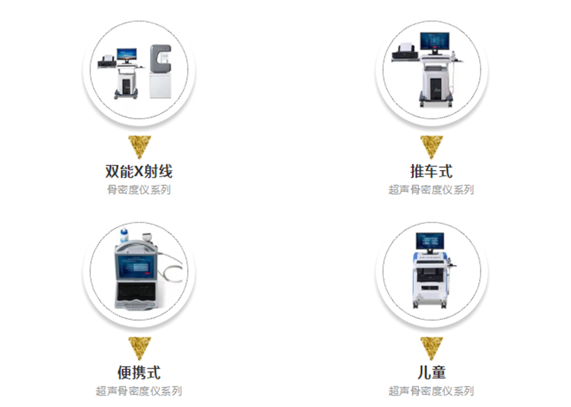 包含雙能X射線骨密度儀系列、推車式超聲骨密度儀系列、便攜式超聲骨密度儀系列、兒童超聲骨密度儀系列等。