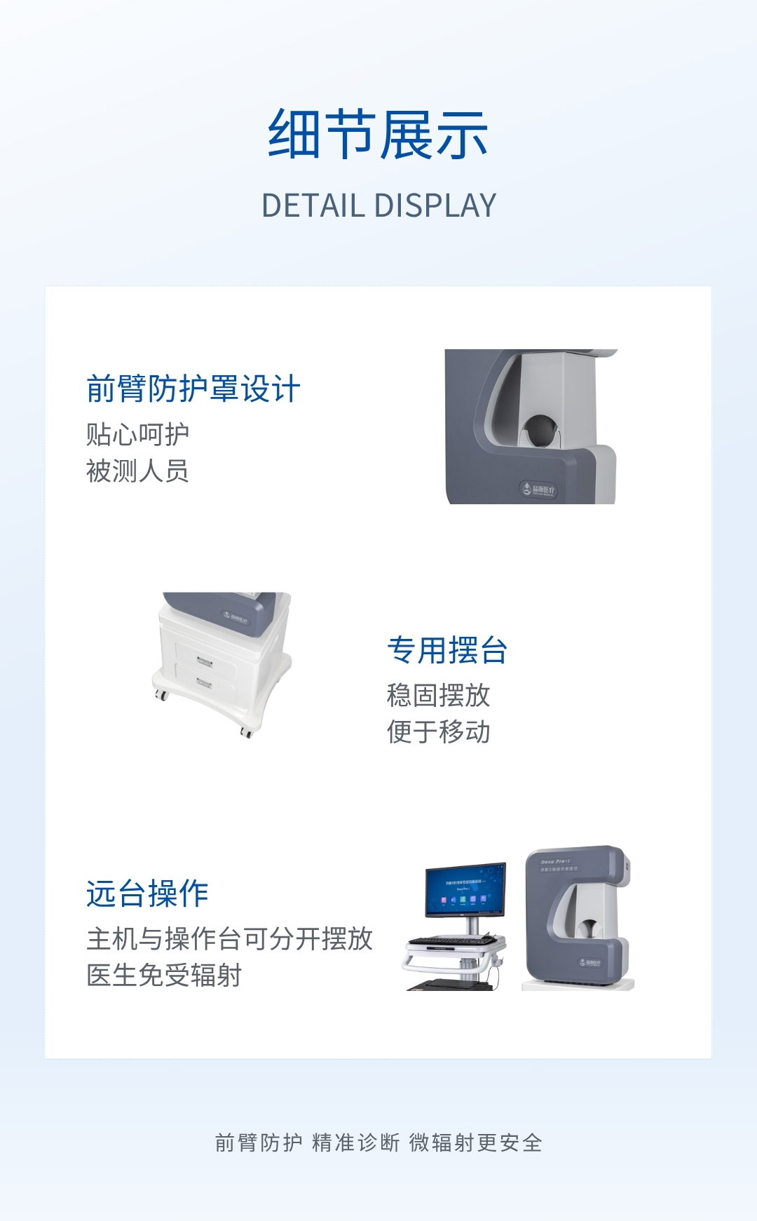 Dexa Pro 系列雙能 X 射線骨密度儀測量手臂前段,這些部位易顯露,操作簡捷,無需消毒。測量速度快,方便醫(yī)生及病人,可用于大人群檢測。